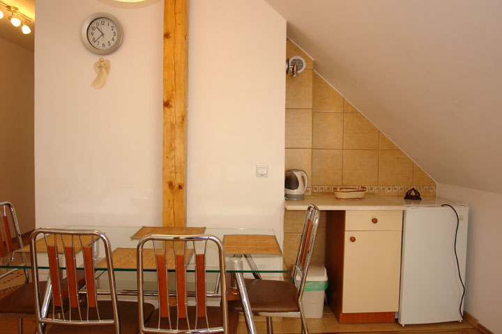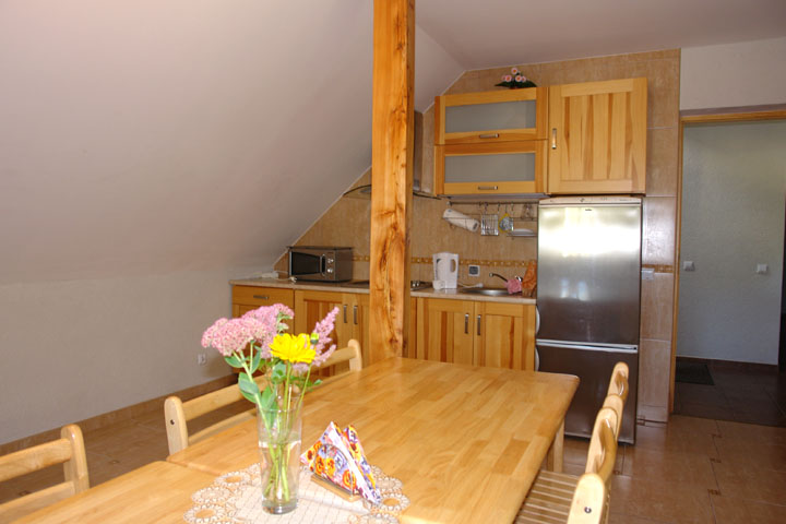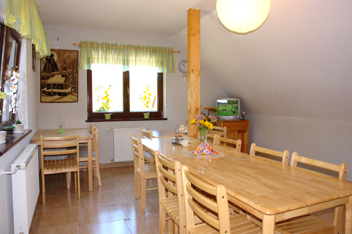 o różnej długości. Latem w przyległych lasach obfitość grzybów i jagód. Oferujemy pokoje 1-, 2-, 3-, 4-osobowe z pełnym węzłem sanitarnym, TV i lodówką. Polecamy całodzienne wyżywienie (domowa kuchnia). Do dyspozycji gości: ogólnodostępny aneks kuchenny, miejsce na grill i ognisko, parking na terenie posesji. Zapraszamy przez cały rok.